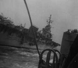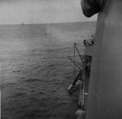 ![]() Capt. Lane and another officer watch the torpedo recovery from the signal bridge.)