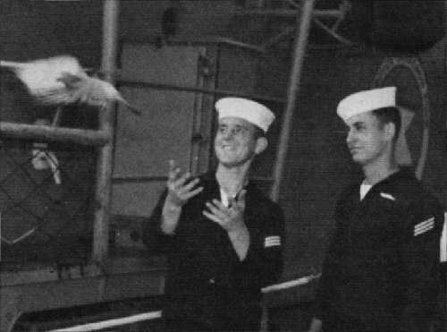 "She left us with a keep sake though. In the box that morning, when we opened it up, WE FOUND AN EGG. That's why she visited the Gearing that night. A swell ship to land on, knowing that the crew would take care of her in her condition. The release was photograghed and is in the ship's book. Ankney and I are shown in the picture. I wonder if he (Ankney) remembers that swell time on the Gearing, just being friendly to a passing stranger in need?"