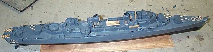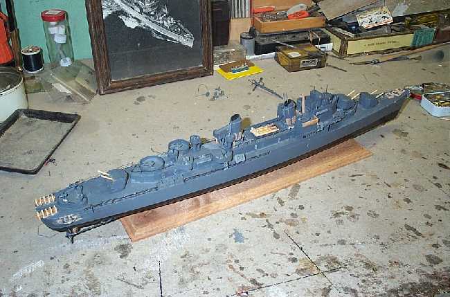At the Annapolis reunion in 1997 Rich Roberts' (MM3 72-73) made the winning auction bid on an unassembled model of USS Gearing. It was the kind of model that requires great wood carving skills and much detail work and Rich took on the job. Just a year later, at the Savannah reunion, he presented the finished model to the USS Gearing Association for display at the reunions. But after five years of serious travel... to Albuquerque, DuBuque, Las Vegas, Cleveland and Norwich, USS Gearing had taken a beating from the shippers. Rich brought the model home for repairs and has provided these photos of the "shipyard availability." Below is the latest work-in-progress photo, taken in mid-January 2004: ![]() Below is an earlier progress report, an email with photos from Connecticut on July 8, 2003: "Tonight its the torpedo tubes and bullwork behind the bridge. Repairs will take just as long as building the model itself because I have to make a lot of fittings and stuff that fell out of the box, and I have already added a few xtras that were left out. Will be in touch ---Richie" |